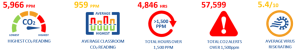 CO2-ის ყველაზე მაღალი დაფიქსირებული მაჩვენებელი – 5,966 ppm (ნაწილი მილიონზე), არის 4,466 ppm-ით უფრო მეტი ვიდრე DfE-ის მიერ რეკომენდებული 1,500 ppm. მიუხედავად იმისა, რომ CO2-ის საშუალო საკლასო მაჩვენებელი ხუთივე სკოლის ყველა კლასში მთელი სასწავლო წლის განმავლობაში იყო 959 ppm, რაც, როგორც ცალკე მდგომი მაჩვენებელი, ცუდი არ არის, 1,500 ppm-ზე მაღალ მაჩვენებლზე გატარებული საათების საერთო რაოდენობა 4,846 საათია, რაც შორს არის იდეალურისგან.